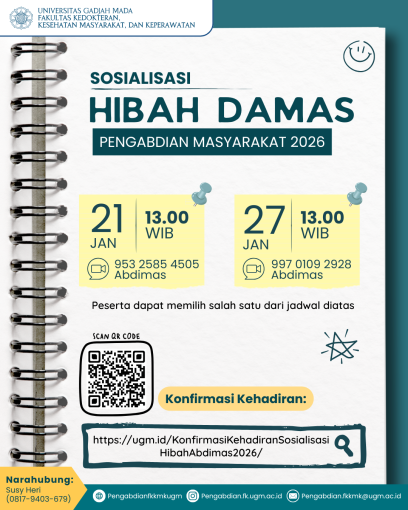 Sosialisasi Hibah DAMAS Pengabdian Masyarakat Tahun 2026 diselenggarakan oleh Fakultas Kedokteran, Kesehatan Masyarakat, dan Keperawatan Universitas Gadjah Mada sebagai upaya memberikan pemahaman komprehensif kepada sivitas akademika mengenai skema pendanaan pengabdian kepada masyarakat. Kegiatan ini ditujukan bagi dosen dan tim pengusul yang berencana mengajukan proposal hibah DAMAS tahun 2026 agar dapat memahami ketentuan, mekanisme, serta arah strategis program pengabdian yang selaras dengan kebutuhan masyarakat.